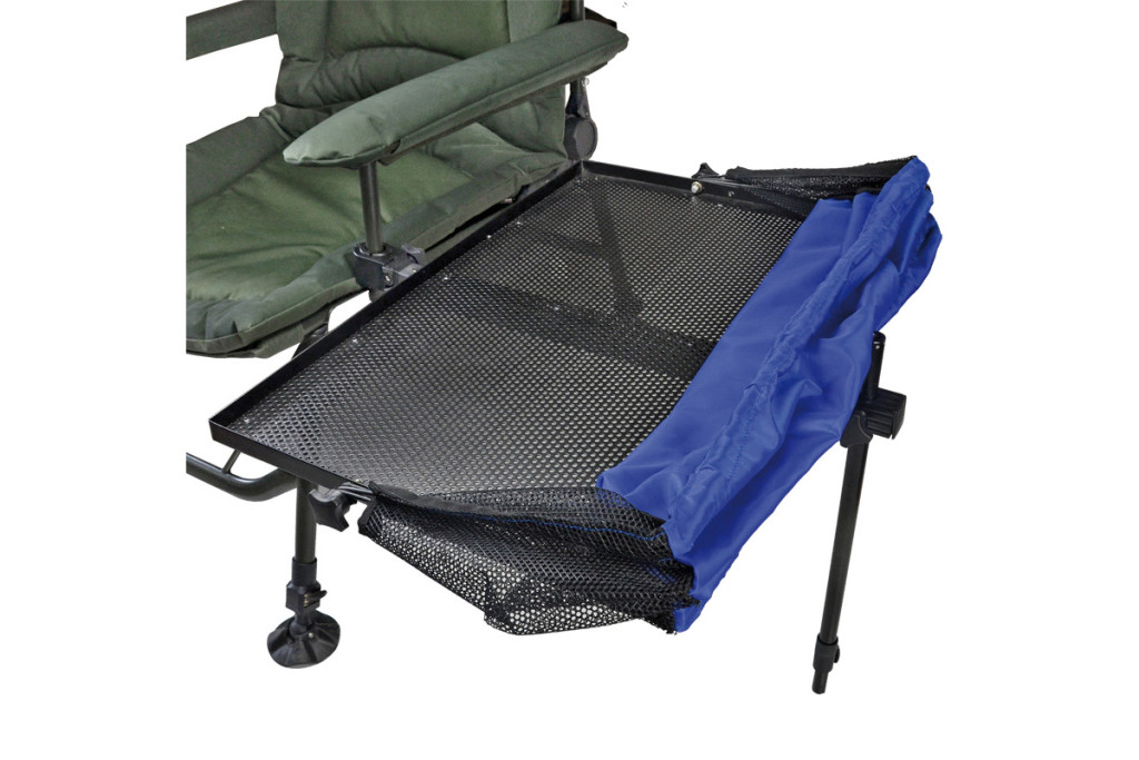 Nagy méretű összecsukható, univerzális oldaltálca horgász ládákhoz és székekhez. Kompatibilis minden székkel. Állítható láb (30-60cm) A felhajtható ernyő megvédi csalinkat a napsütéstől vagy az esőtől.